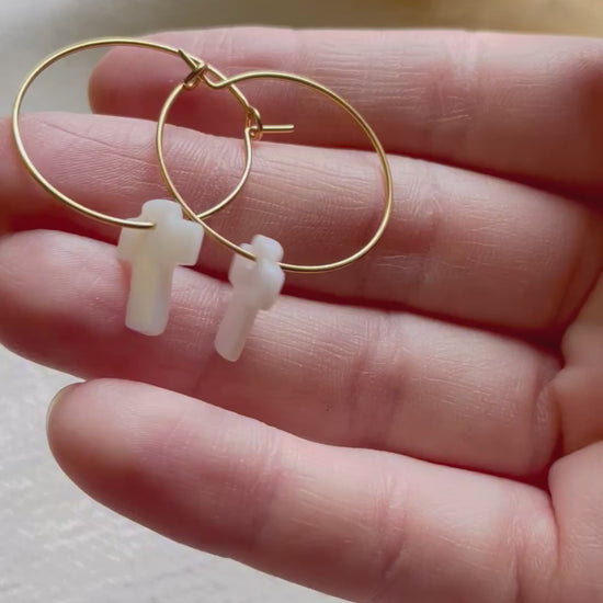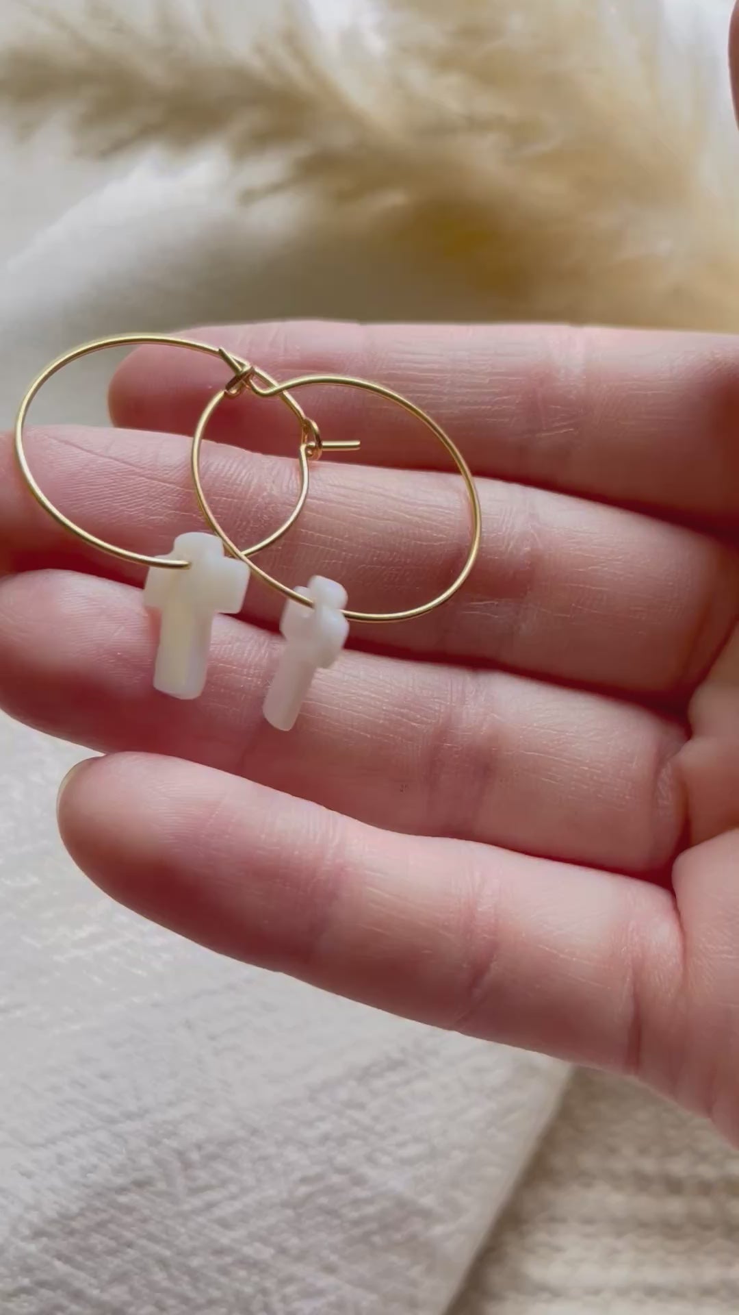 Boucles d’oreilles créoles avec breloque croix en nacre