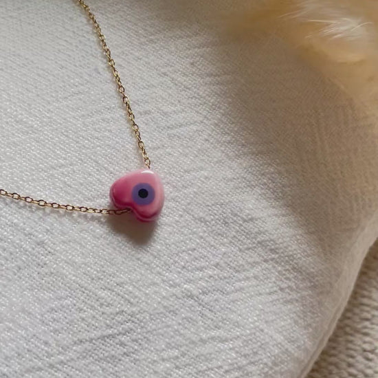 Un collier en acier inoxydable de 45 cm, orné d’un pendentif en forme de cœur rose sublimé par un œil en céramique. Symbole de protection et de bienveillance, il allie douceur et caractère.