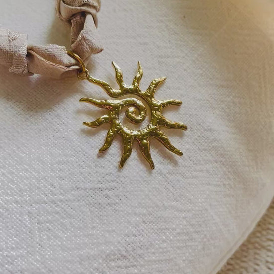 Un bijou lumineux et original, composé d’un pendentif soleil en acier inoxydable qui capte la lumière avec élégance. Son contour n’est pas une chaîne classique mais un cordon en tissu taupe pour un style à la fois moderne et bohème.