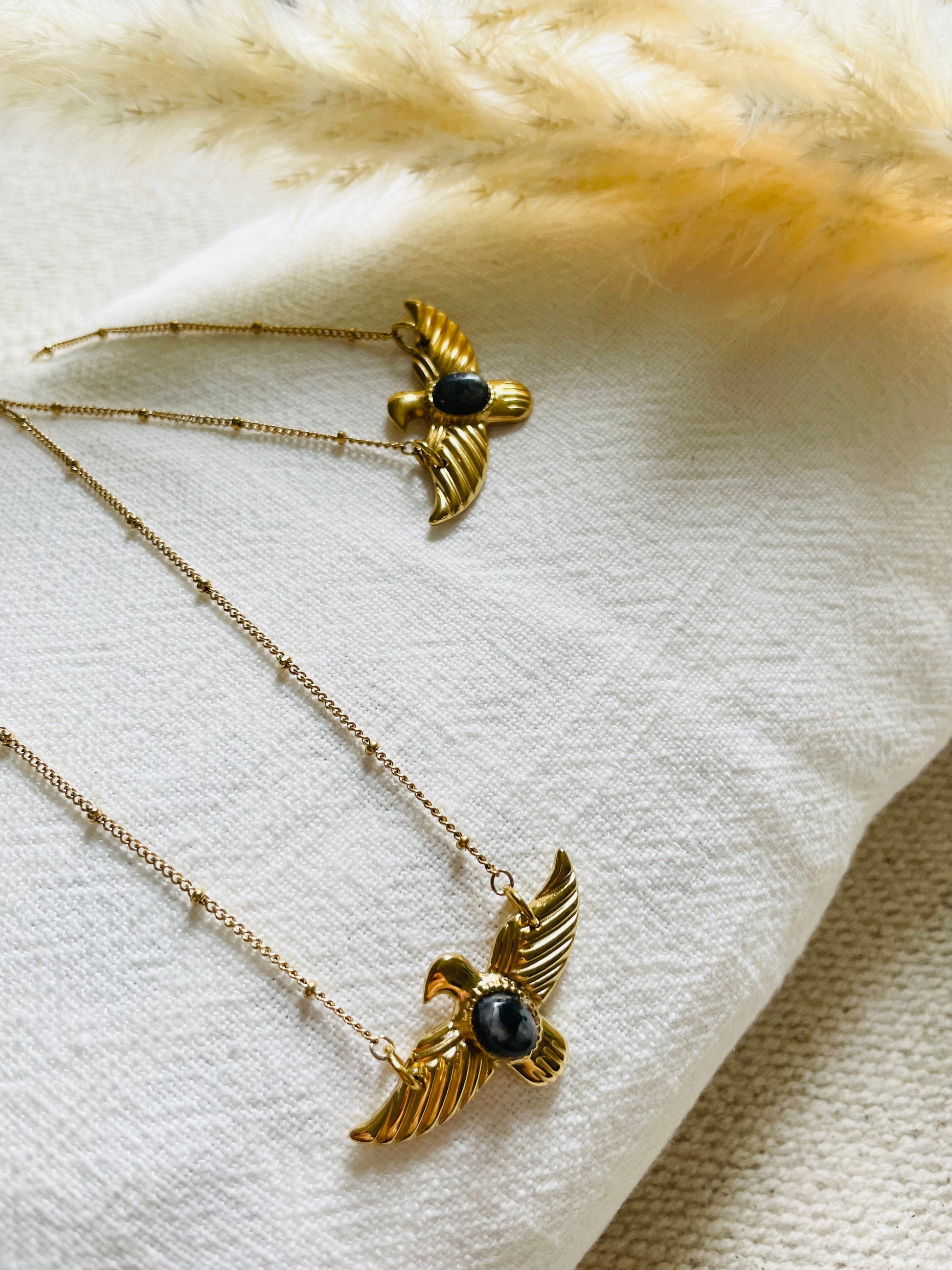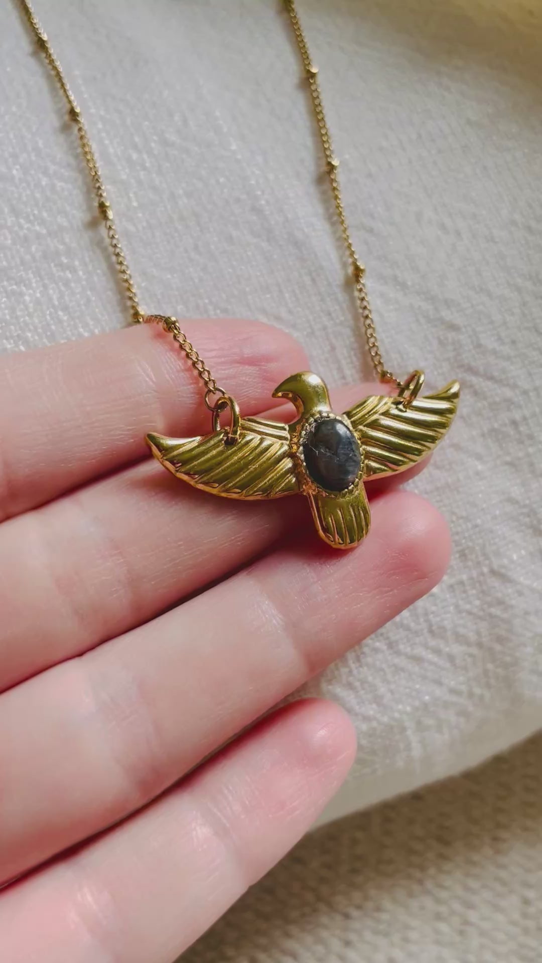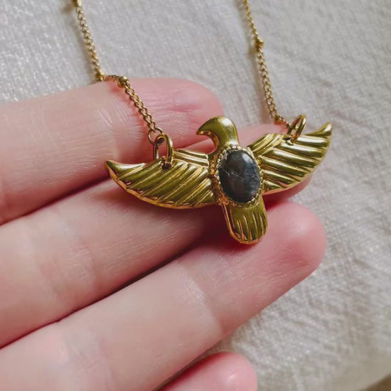 Symbole de force et de liberté, ce collier associe la puissance de l’aigle à l’énergie protectrice de la labradorite.