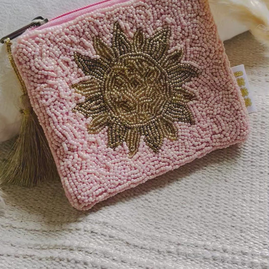 Laissez entrer la lumière avec cette pochette perlée rose et dorée, où un soleil étincelant prend vie. Un pompon délicat ajoute une touche ludique et raffinée, pour un accessoire qui illumine chaque moment